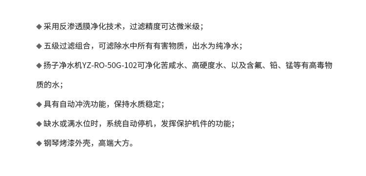 ●出水水質(zhì):符合《生活飲用水水質(zhì)處理器衛(wèi)生安全與功能評價規(guī)范-反滲透水質(zhì)處理器》(2001)的要求